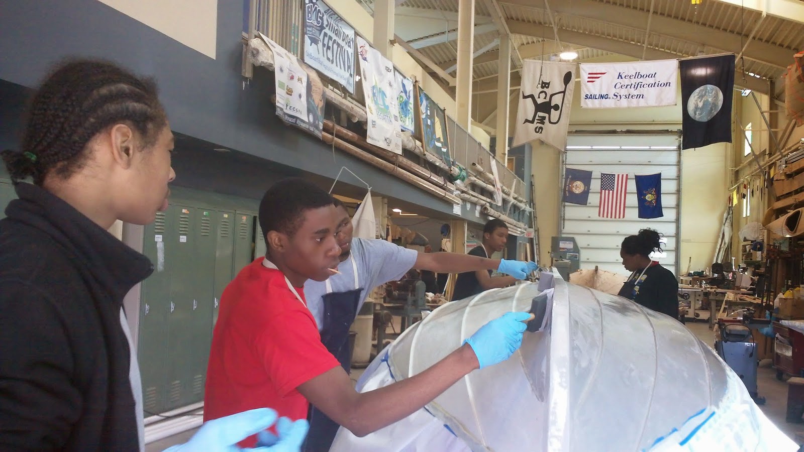 | My classmates and I are painting the skiff with a special coat of bottom paint to prevent algae and zebra mussels from growing on the underside of the boat. |